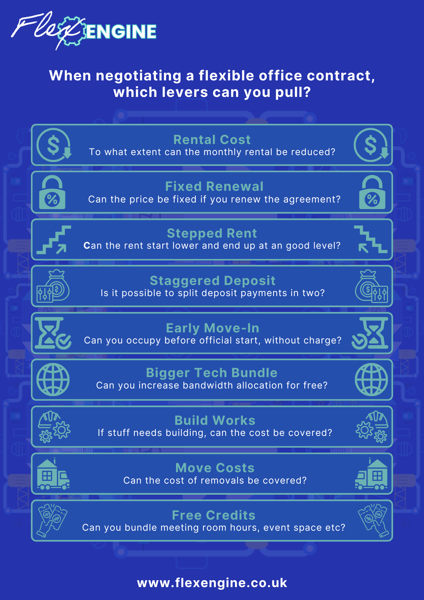 When negotiating flexible office contracts, what levers can you pull as the client to get the best possible outcome? Price is just one aspect of this process, but it has implications down the line… The further down it does, the further up it’s likely to have to move when the time comes to open renewal negotiations at contract end. Instead, consider taking a wider view of the possibilities to structure things in a way that ticks lots of boxes